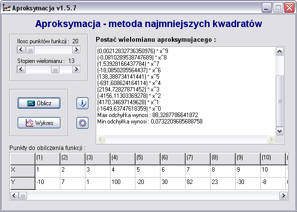 Oblicz program obliczy postać naszej funkcji oraz największą i najmniejszą odchyłkę tej funkcji od wpisanych punktów.