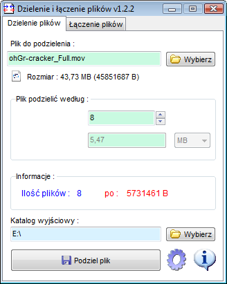 Plik do podzielenia wybieramy plik do podzielenia, lub przeciągamy wybrany plik do okna programu.